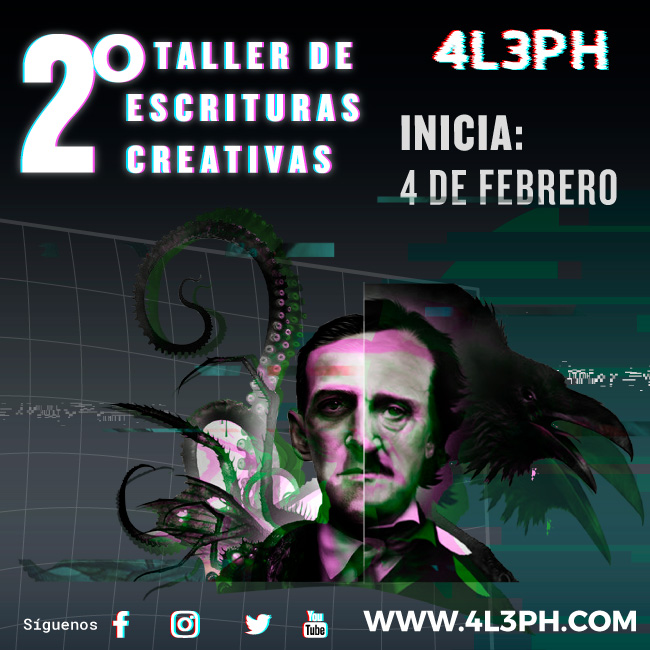 El colectivo 4l3PH te invita al 2° Taller de Escrituras Creativas 4l3ph que comenzará a partir del jueves 4 de Febrero de 2021.