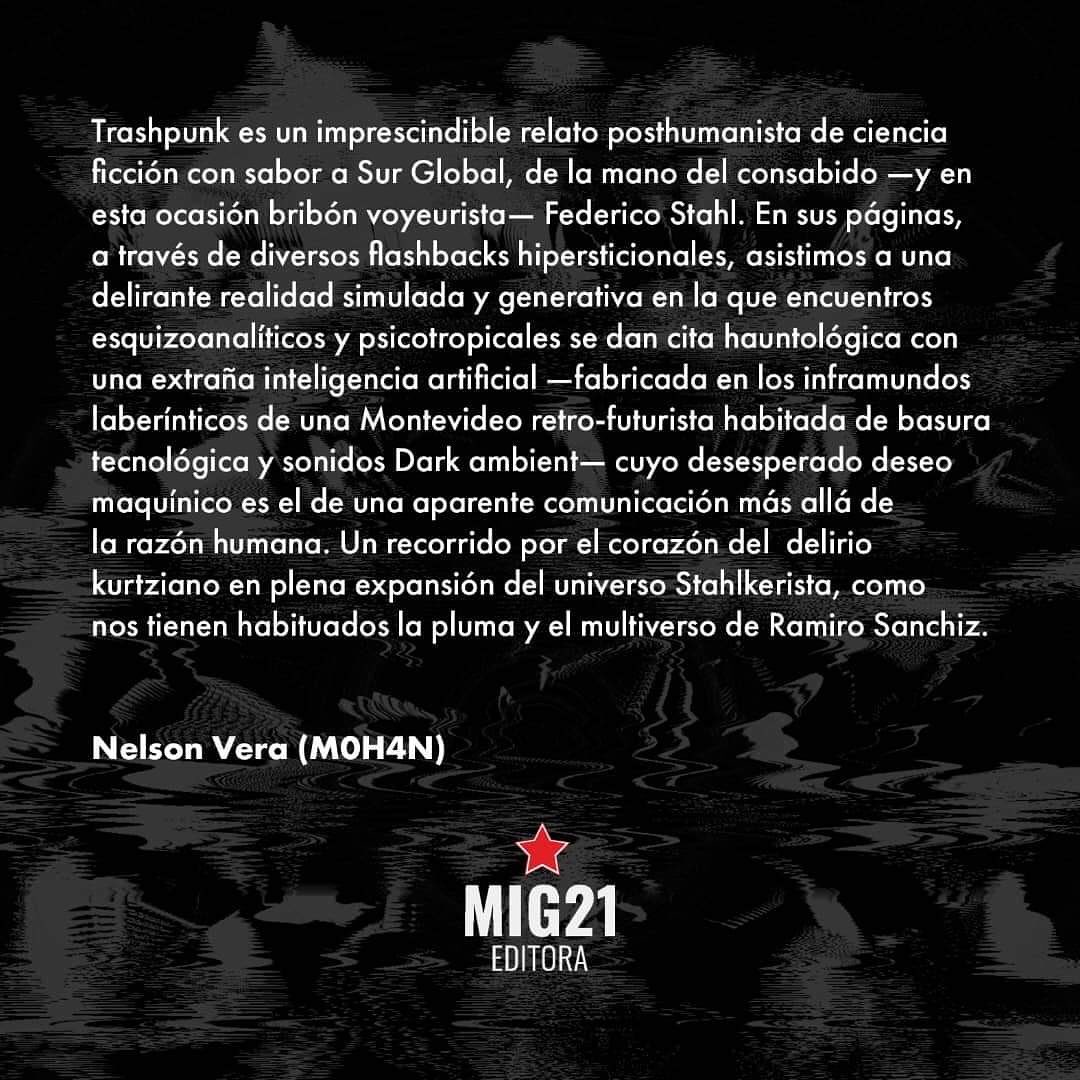 Para unirnos a esta jarana, les queremos compartir, el enlace que los dirige hacia su nueva (¡y reloaded!) novela: “Trashpunk”, junto a una muy entusiasta recomendación de nuestra parte; para que desde ya se hagan a este novelón hipersticional, editado por la extraordinaria casa (haunteada) editorial Mig21. La pueden descargar en formato digital (de libre descarga) en el enlace anexo, y también la pueden encargar en formato físico (para compras en línea; dirigiéndose a la página de Mig21).