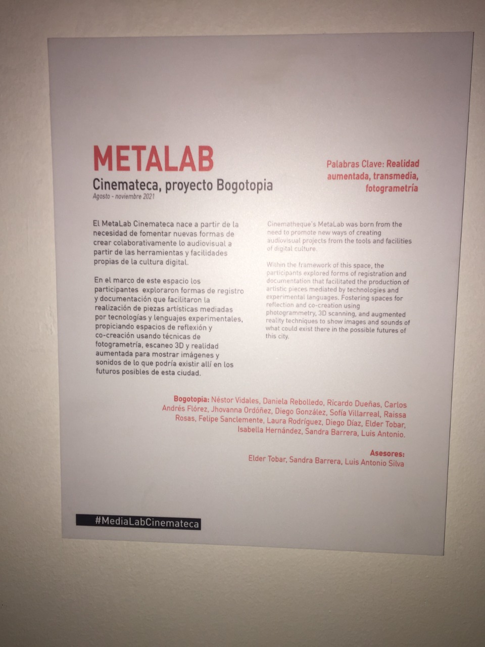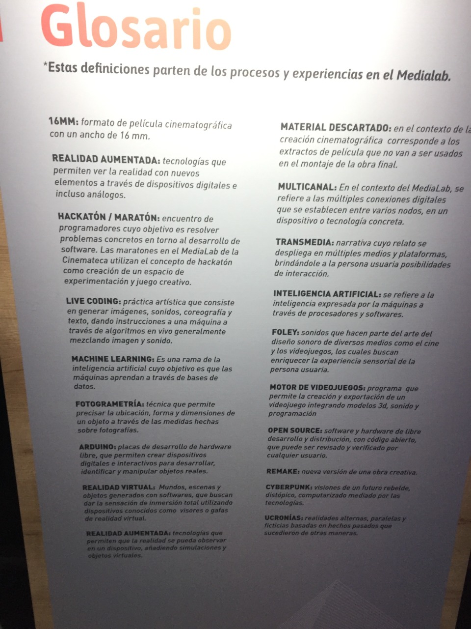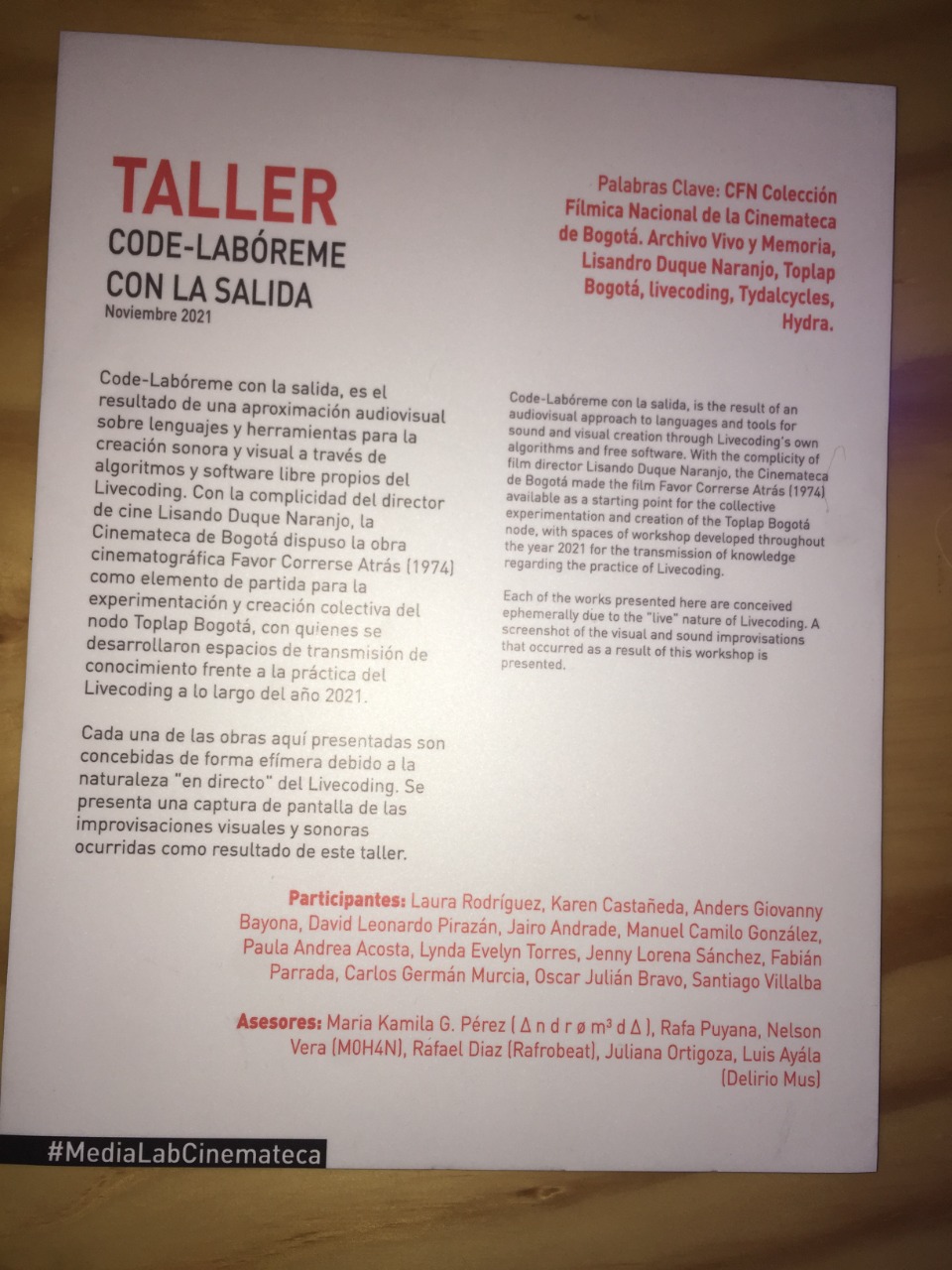 ¡¡¡Hola, mundo!!! Y así estuvo nuestra visita y participación en la inauguración de la #MediaExp organizada por el Media-Lab en colaboración con la línea de Archivo Vivo y Memoria de la Cinemateca de Bogotá, con el apoyo del Instituto Distrital de las Artes Idartes Nuestra code-laboradora Lynda Evelyn se marcó una maravillosa performance de Live Cinema y VideoMapping con nuestra pieza de Videoarte —basada en el relato del escritor de ciencia ficción y ficción especulativa colombiano, René Rebetez— “Mateo, dos, dos, guion, cuatro”; y también se inauguró la visita a diversos espacios con muestras retrospectivas llevadas a cabo en los últimos años en la Cinemateca, donde nuestro code-laborador Nelson Vera ha participado como facilitador en talleres/laboratorios y en la realización de performances alrededor de su consabida práctica que relaciona Live Cinema y Live Coding (y que él ha denominado Alg-Live Cinema), en esta ocasión con la performance y taller “Code-labóreme con la salida” (trabajando con la obra de archivo fílmico “Favor correrse atrás” del maestro y director colombiano Lisandro Duque), de la mano de la red Toplap Bogotá (nodo de la red mundial de Live Coding, Toplap). Por demás, la invitación es a que no se pierdan de esta magnífica exposición permanente que irá hasta el 29 de mayo, con sus múltiples actividades como visitas guiadas, microtalleres, proyecciones, instalaciones interactivas y experiencias inmersivas, entre muchas otras actividades que han orbitado alrededor de lo que diversos actores hemos venido conectando en estos años en colaboración con la Cinemateca, en la relación: Cine, Artes Audio-Visuales, Narrativas y Experimentación con Nuevos Medios y Tecnologías. Seguimos, entonces, familia y… ¡¡¡Salut, world!!!