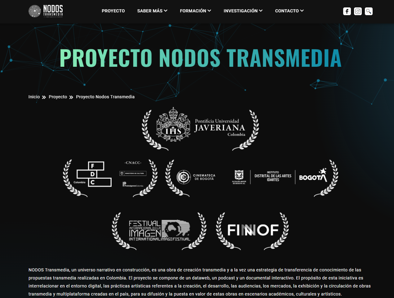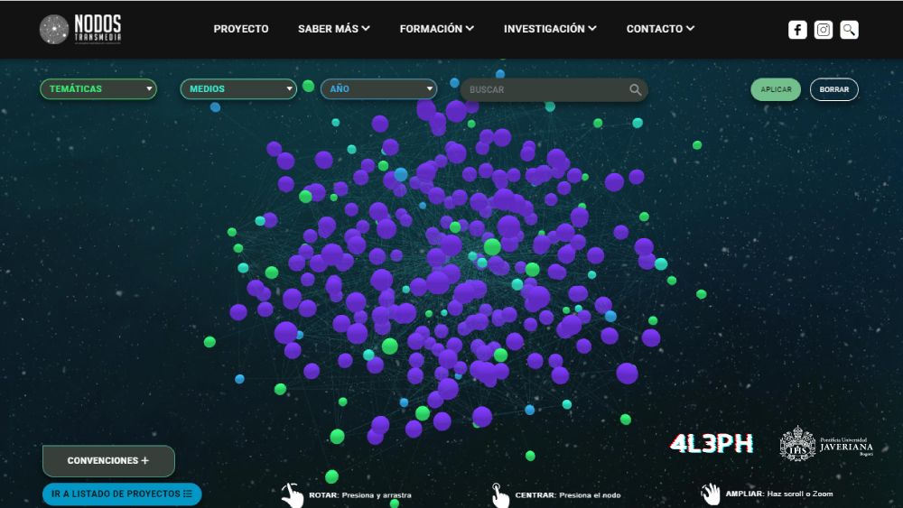 Con mucho orgullo presentamos el portal web «Nodos Transmedia, un universo narrativo en construcción», un proyecto de investigación y obra de creación liderada por Ana Teresa Arciniegas y Norberto Díaz de la Pontificia Universidad Javeriana – Bogotá y Cali, Colombia, que recopila proyectos transmedia llevados a cabo en Colombia desde 2009 hasta 2022. Este proyecto, que diseñamos y desarrollamos, se compone de tres elementos clave: un dataweb, un documental interactivo y un podcast, que en conjunto forman una extensa colección de obras.