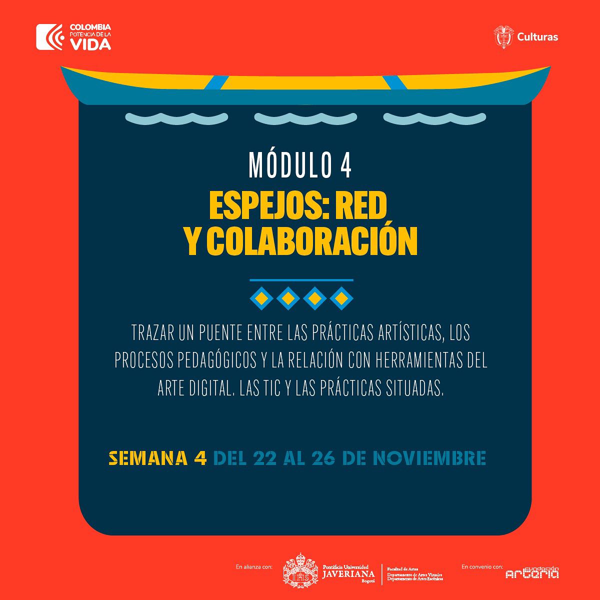 Así vivimos la experiencia del módulo “Espejos: Red y colaboración”, que impartimos en el marco del Diplomado “Espejos y cartografías”, con los muy comprometidos y talentosos artistas-formadores, creadores y gestores culturales de la ciudad de Yopal y de diversas regiones del departamento de Casanare, trabajando durante varios intensos y emocionantes días del mes de noviembre, para, a partir de varios detonantes filosóficos y reflexivos contemporáneos, desarrollar de forma colaborativa unas cartografías multimedia experimentales —de saberes y experiencias—, de los participantes en el territorio, a través del tejido y ensamblaje con nuevas plataformas y herramientas tecnológicas y digitales, colaborativas y en red; y, a partir de allí, llevar a cabo un ejercicio participativo y colaborativo para la reflexión, diseño y creación de unos mapas narrativos especulativos y experimentales, desde una perspectiva “llanerofuturista”, de cara a la imaginación de unos mundos y futuros “otros” posibles y deseables, en red, en y desde la región. Muchas gracias al Departamento y Carrera De Artes Visuales de la Facultad de Artes de la Pontificia Universidad Javeriana, y al Área de Artes Visuales del Ministerio de las Culturas, las Artes y los Saberes Ministerio de Cultura, por esta grandiosa invitación; y, por demás, deseando desde ya, que continúen estos extraordinarios espacios y procesos de investigación-creación y de arte-formador, para seguir compartiendo, imaginando y construyendo, en red y de forma colaborativa, más “posibilidades de otros posibles”, con magníficos y comprometidos artistas, docentes, gestores locales y comunidad en general, en las distintas regiones del país: ¡“El futuro será llanero o no será”! Salut.