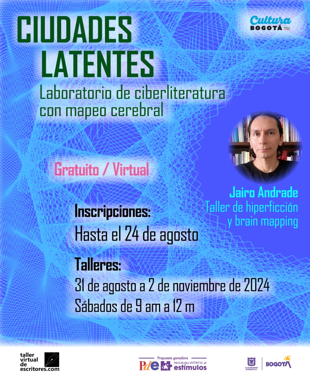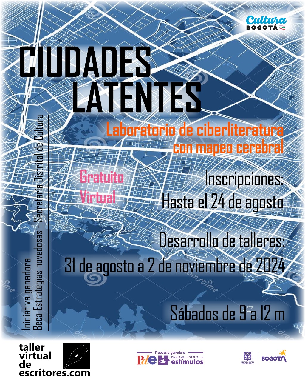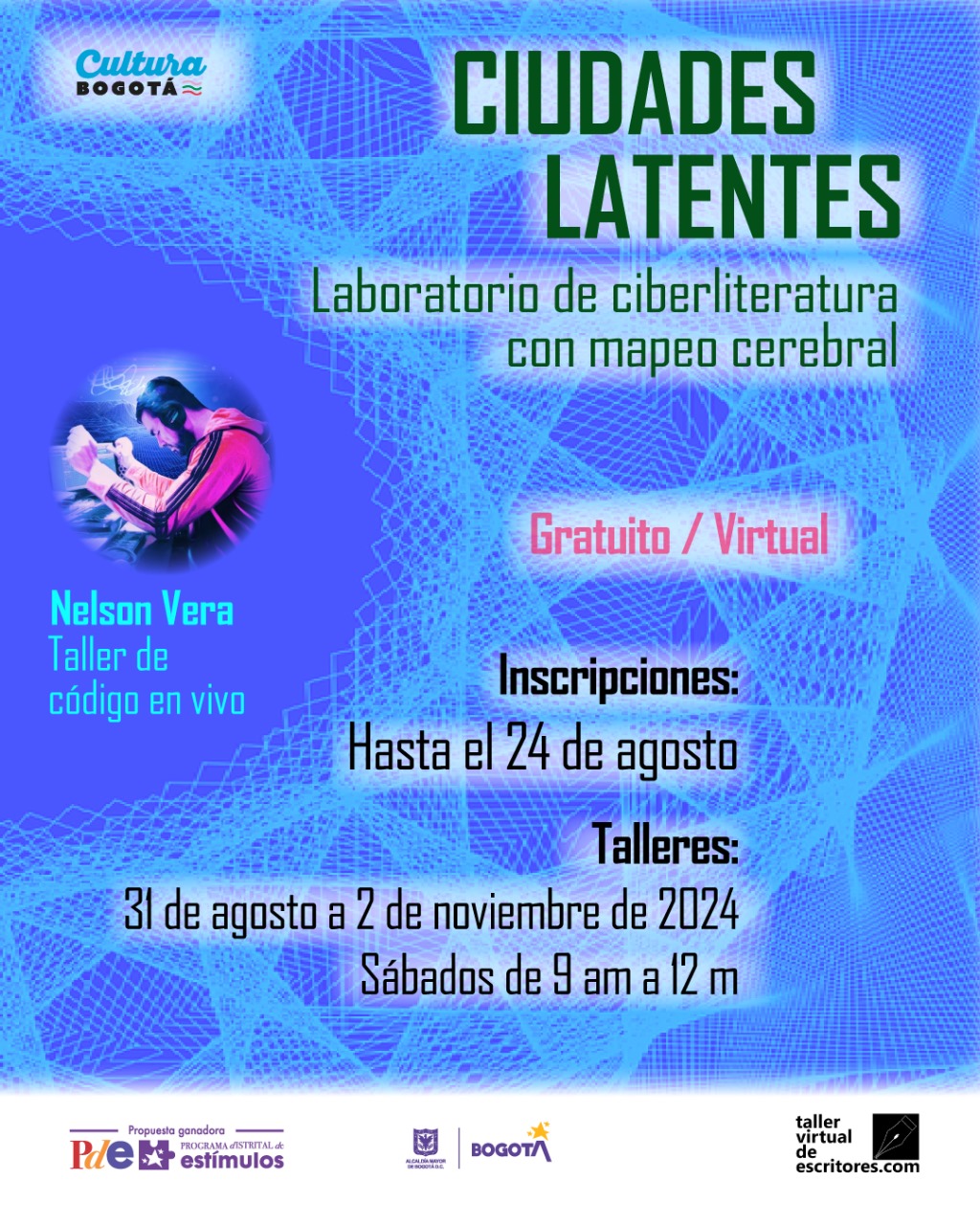 Saludos, querid_s amig_s. Deseamos invitarles a participar en el laboratorio gratuito de experimentación «Ciudades Latentes», por invitación del Taller Virtual de Escritores, ganador de la beca del programa Estrategias Novedosas de la SDCRD. Este taller pionero en ciberliteratura, conjugará con los participantes la creación de hipertextos, código en vivo y mapeo cerebral (brain mapping), para crear mundos imaginarios a partir de la palabra, la imagen, las percepciones y las experiencias sensoriales.