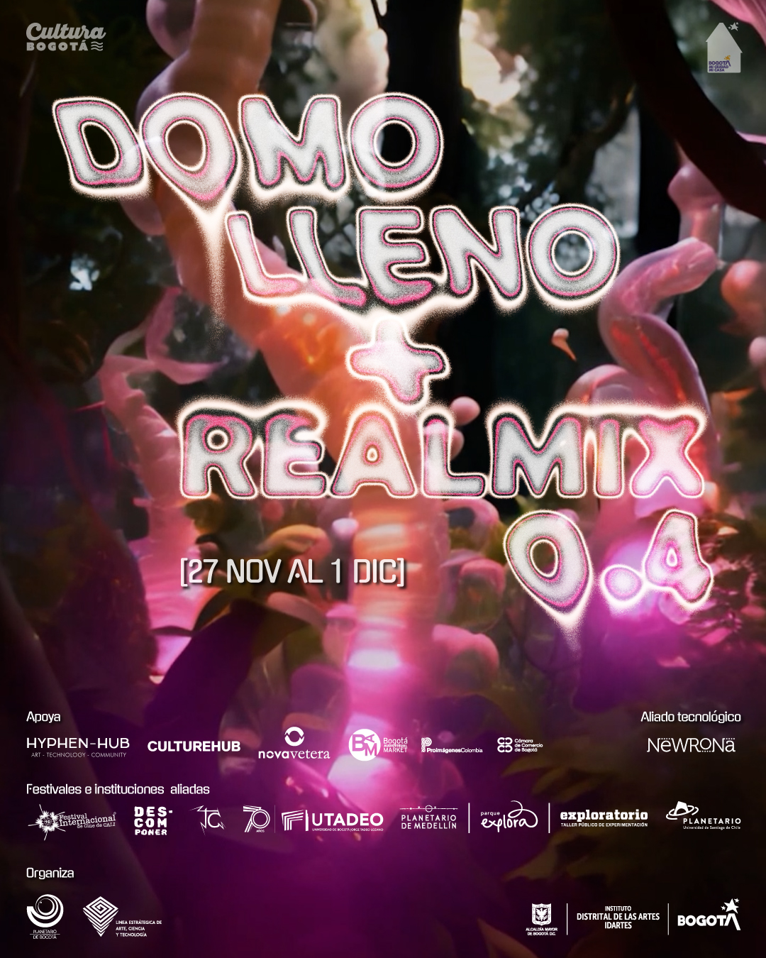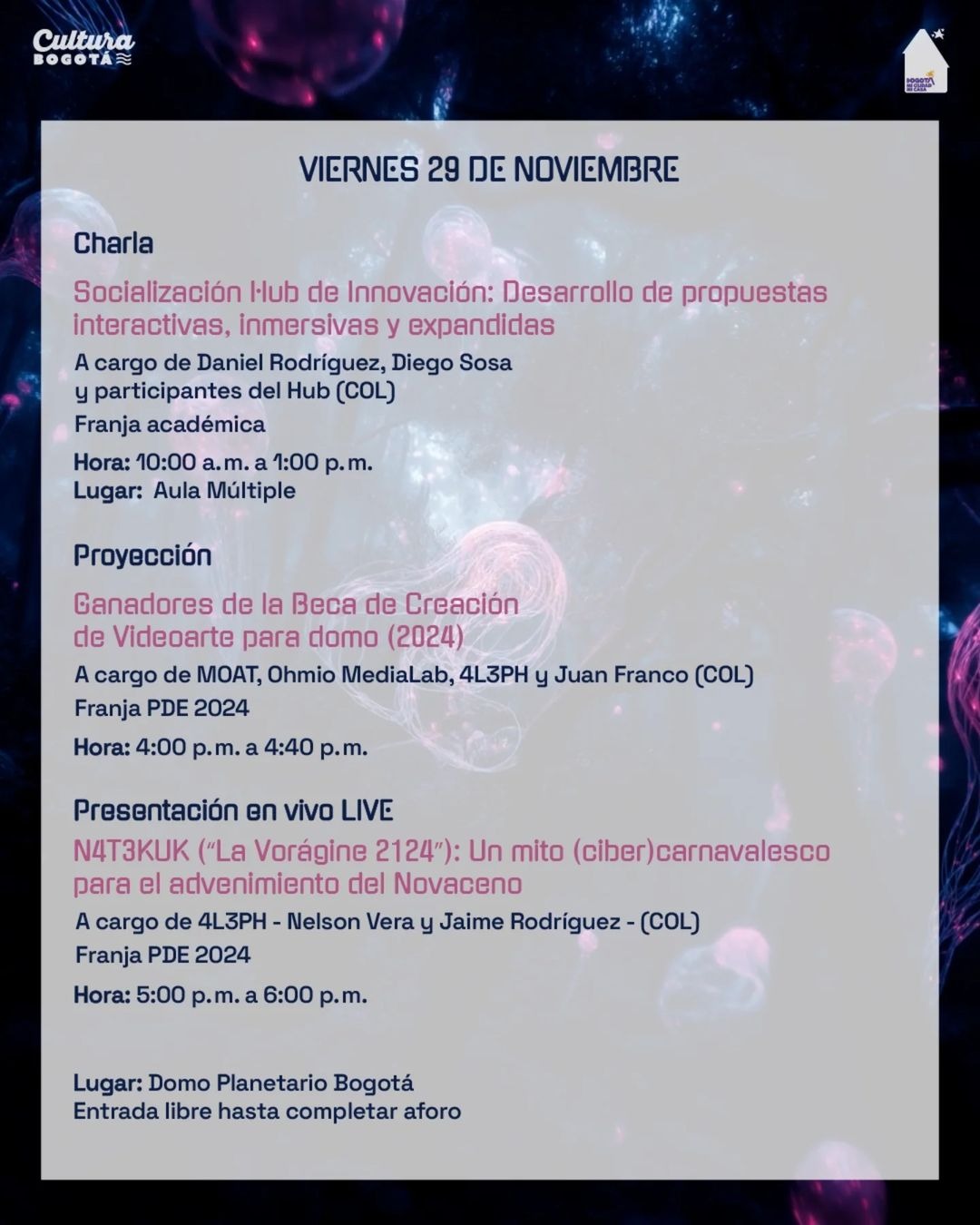 Hola, amig_s 4L3PHian_s. Así transcurrió nuestra participación en el Festival Domo lleno 2024, realizado la semana pasada en el Planetario de Bogotá, organizado por la Línea de Arte, Ciencia y Tecnología de IDARTES, con nuestra obra ‘N4T3KUK («La Vorágine 2124»): Un insólito mito (ciber)carnavalesco para el advenimiento del Novaceno’, a través de la franja de proyección de las obras ganadoras de la “Beca de Creación de Videoarte para Domo 2024” de IDARTES, cerrando por demás la jornada del día viernes con el emocionante estreno de nuestra obra en su versión de cine expandido en vivo para Domo. Estuvo todo increíble y alucinante, apenas para permitir expandir la percepción y la conciencia, en clave especulativa y experimental, como tanto nos gusta compartir con ustedes a través de nuestras prácticas y rituales. Muchas gracias a todas las personas, familiares, amigas y amigos, compañeros y colegas, y al público en general quienes asistieron a las proyecciones y a la premier de nuestra obra en su versión de cine expandido en vivo para Domo. Fue muy emocionante verles y poder compartir con ustedes.