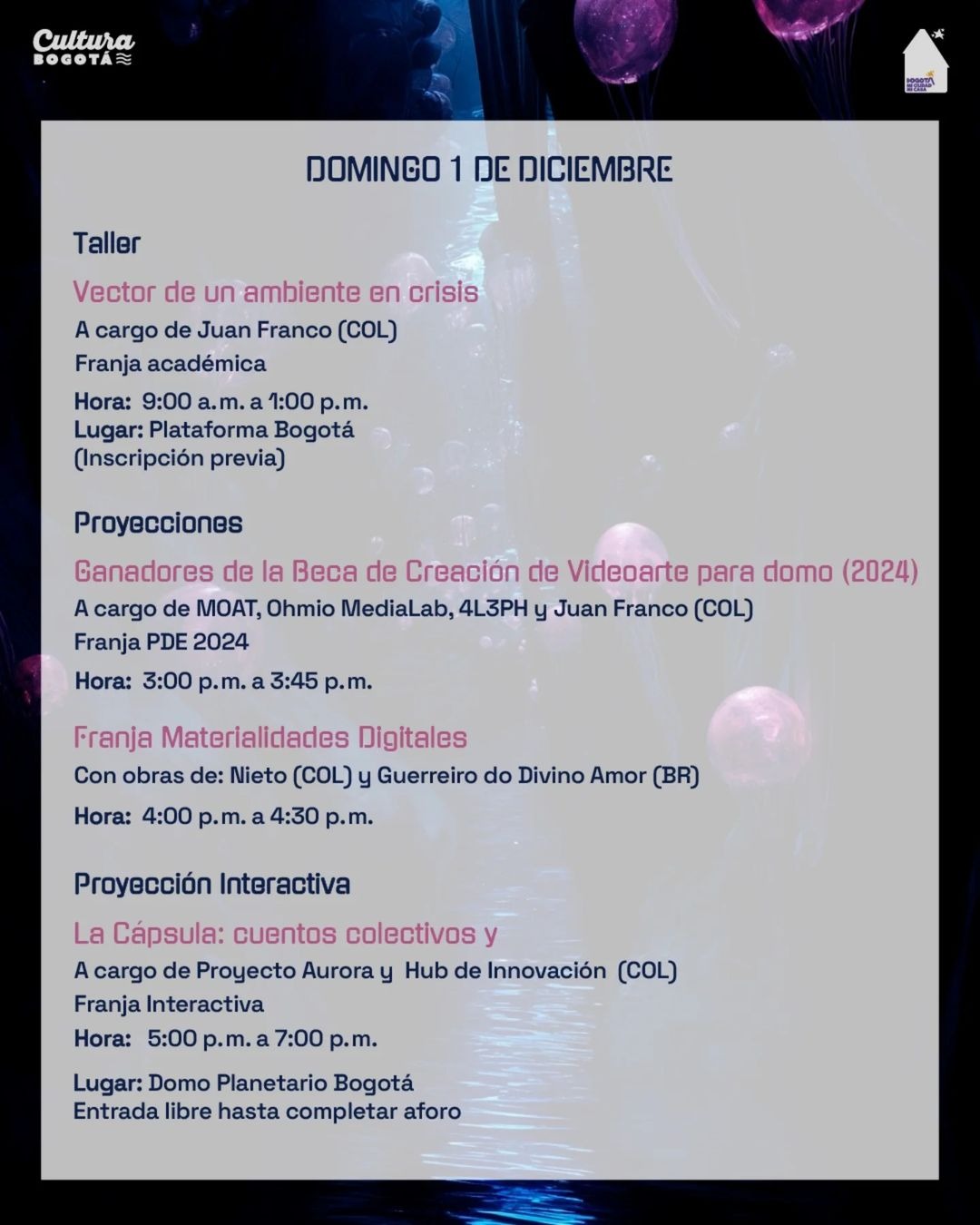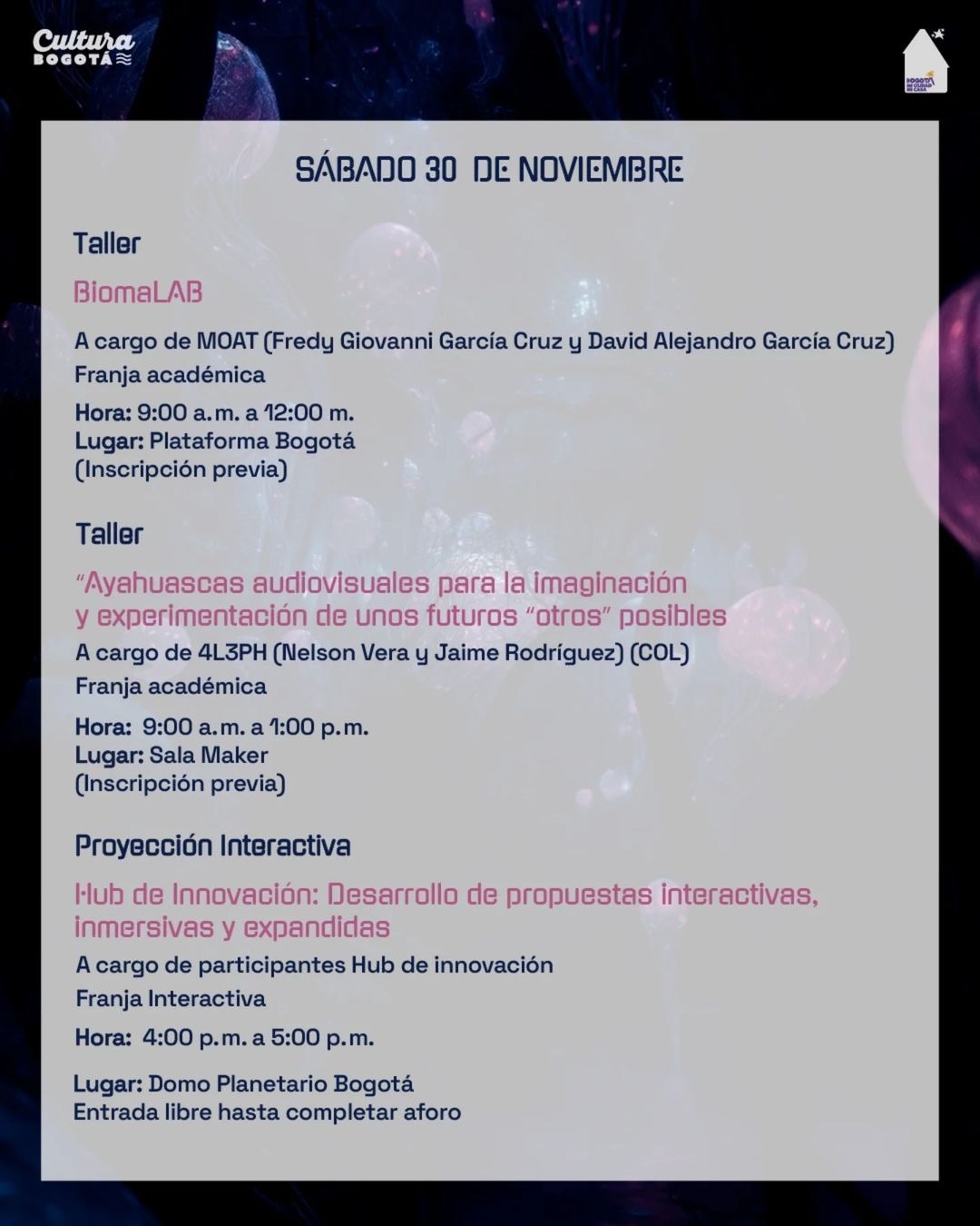 Muchas gracias a IDARTES, Plataforma Bogotá, LineaACT, CKWEB y Planetario de Bogotá por la invitación, y, sobretodo, a las maravillosas y talentosas personas y colectivos que se inscribieron y se sumaron a este ritual reflexivo-creativo, para compartir conocimientos y experiencias “expandidas”, de la mano de la mejor energía ciberayahuasquera. Salut!!!